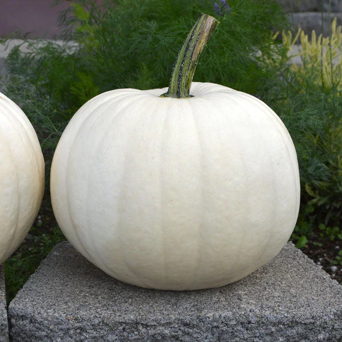 Elegant, ghostly white pumpkin, this gourd is a true show stopper in your porch pile. About the size of a volleyball, they average 5-7 lbs and are excellent for carving and painting. If you simply set her on the step, she’ll reward you with stately beauty all season long.